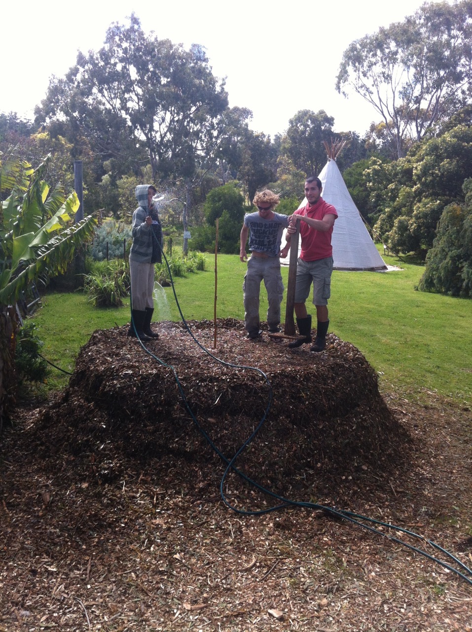 Creating an aerobic compost will give a quick and very hot result that will then cool down quickly, great for gardening but not for hot water systems. Below is the method we use but please refer to Jean Pain for a more detailed information (and a far grander scale system).