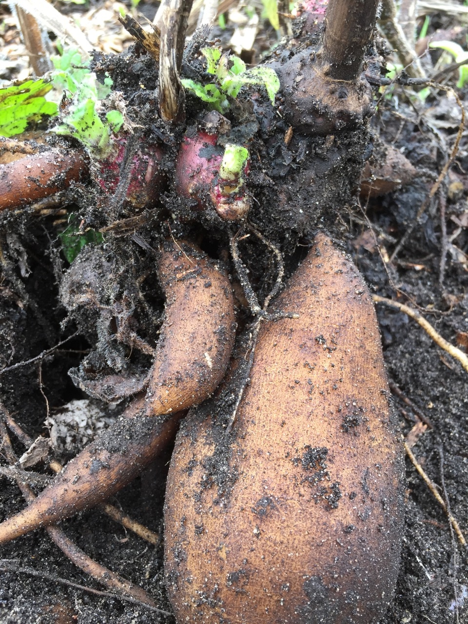 Yacon forms two distinct types of tubers, a swollen brown tuber that is harvested for eating and a smaller reddish rhizome at the base of the stem that the new shoots grow from.