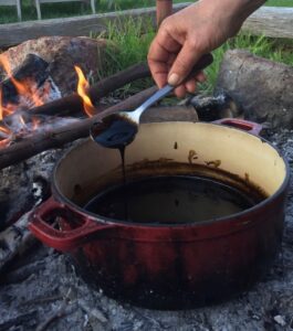 It took around 5 litres of yacon juice and 24 hours cooking to to get 300ml of yacon syrup, a thick black molasses type product, slightly bitter (and mine is slightly smokey!).