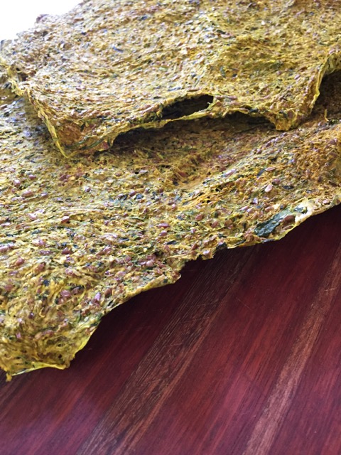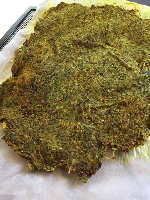 Place about a hand full of the mix on the drier tray, I don’t have any silicon sheets so I use a sheet of baking paper on the tray (and reuse about 4 times)